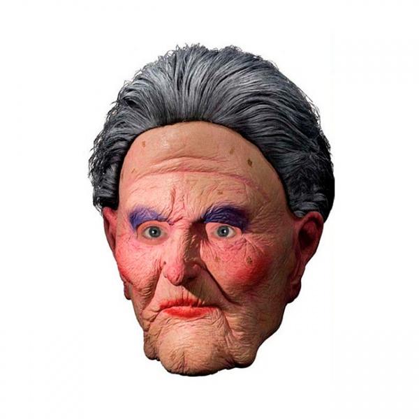 Granmamma maske er en flott naturtro latexmaske med tykt grått hår og knute i nakken.